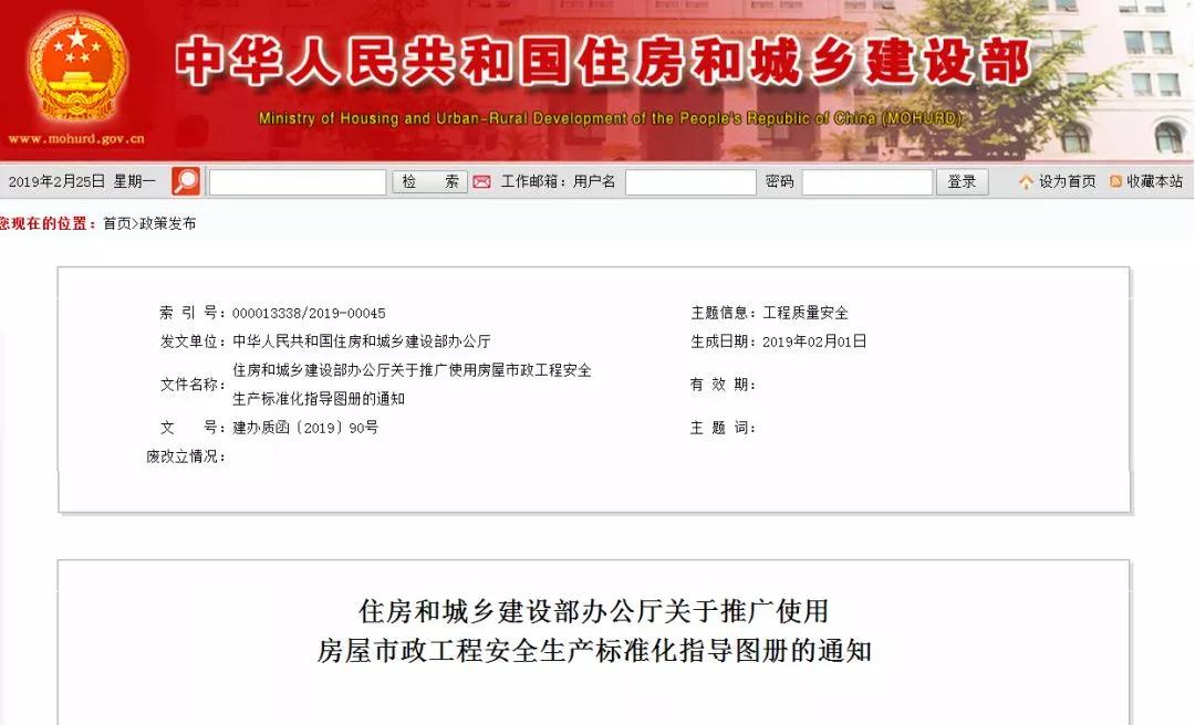 住建部发布《房屋市政工程安全生产标准化指导图册》,并要求全国推广使用发布日期:2019-02-28