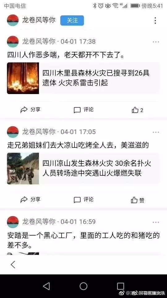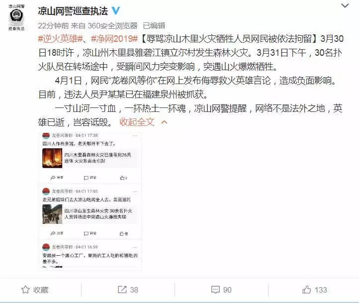辱骂凉山火灾牺牲英雄,该抓!发布日期:2019-04-03