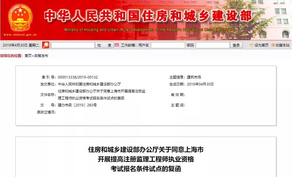 2019年4月30日住建部发布《关于同意上海市开展提高注册监理工程师执业资格考试报名条件试点的复函》:同意上海市开展提高注册监理工程师执业资格考试报名条件试点,试点自2019年4月30日开始。