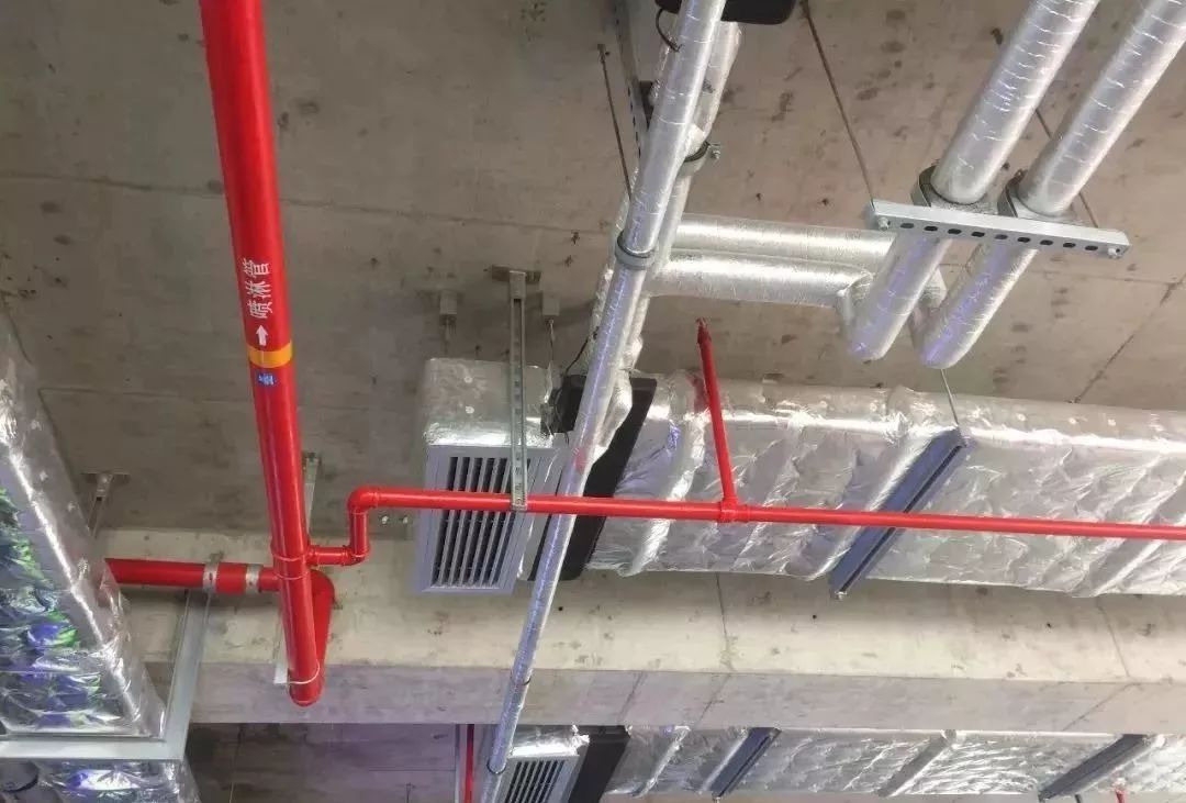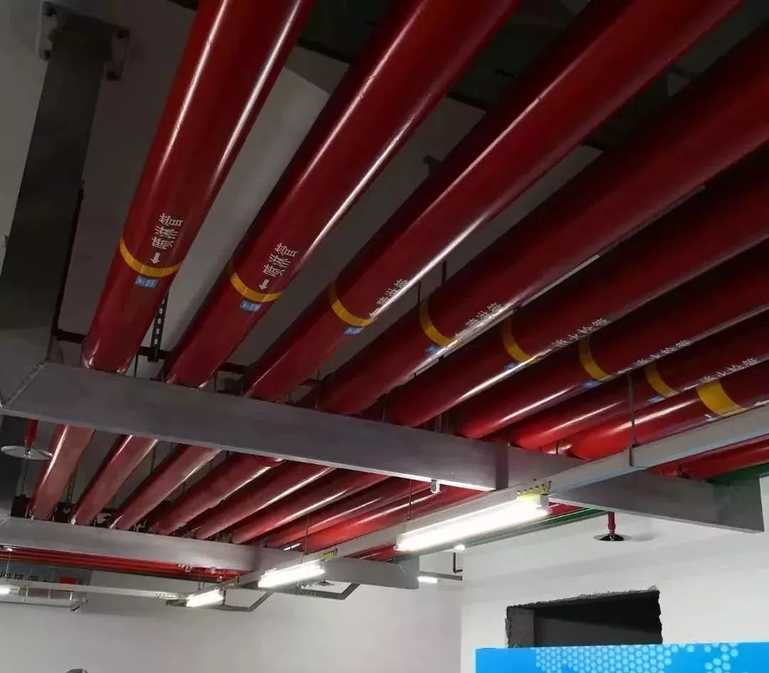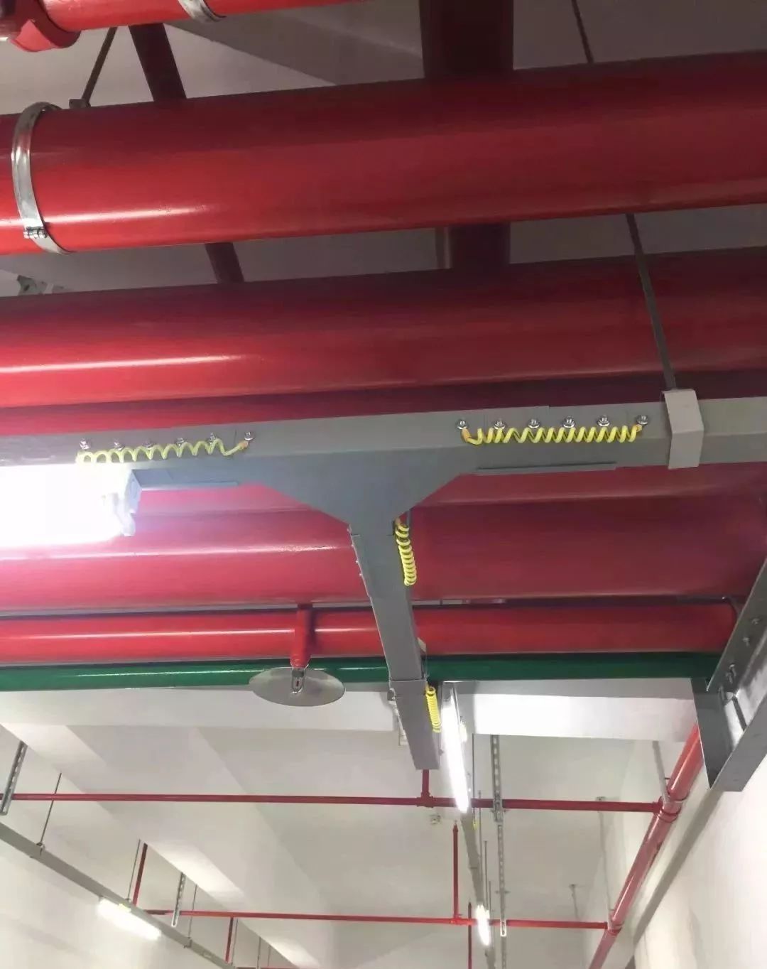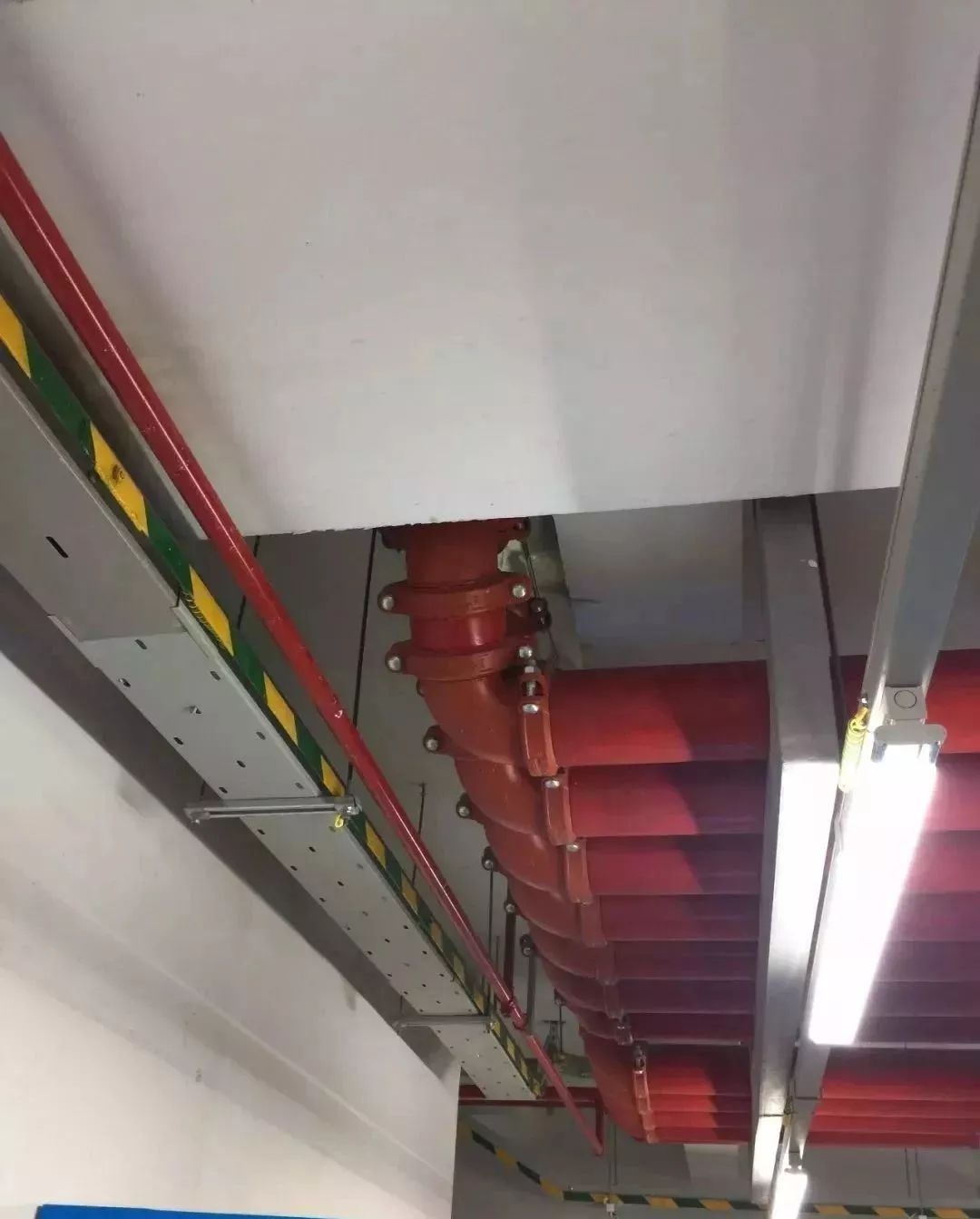 消防喷淋管道间距一致,标识清楚、成排成线。