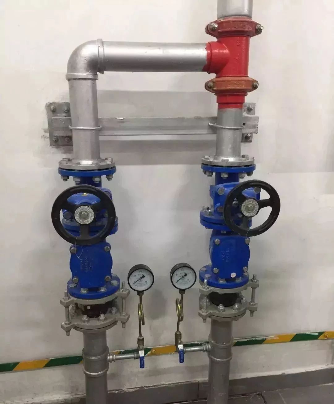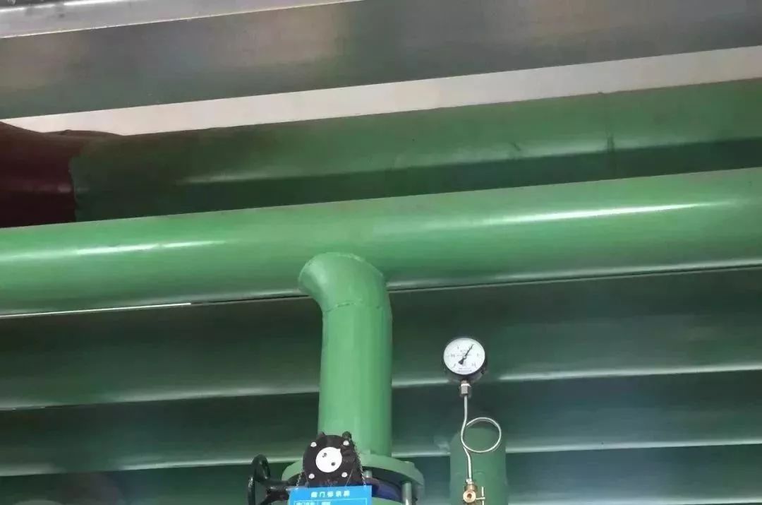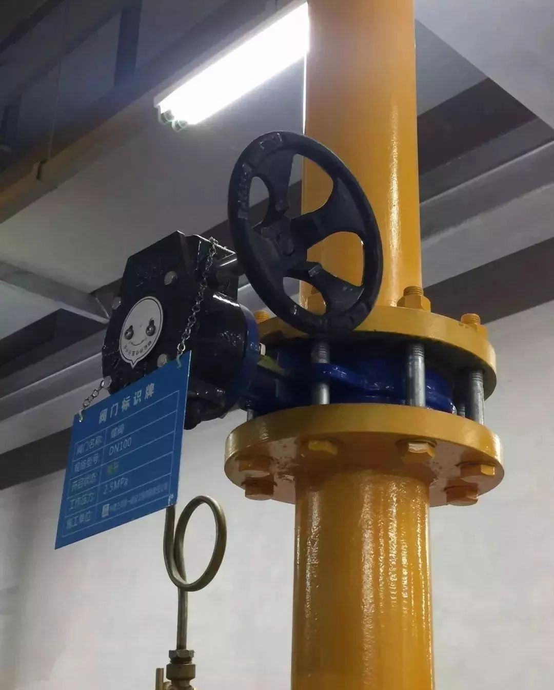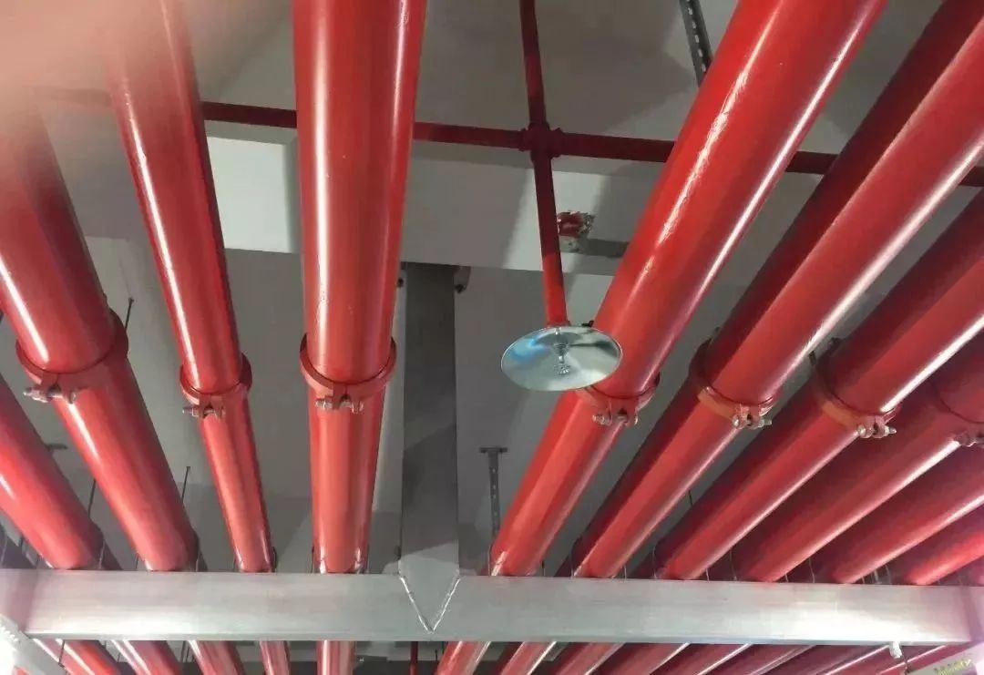 消防喷淋管道间距一致,标识清楚、成排成线。
