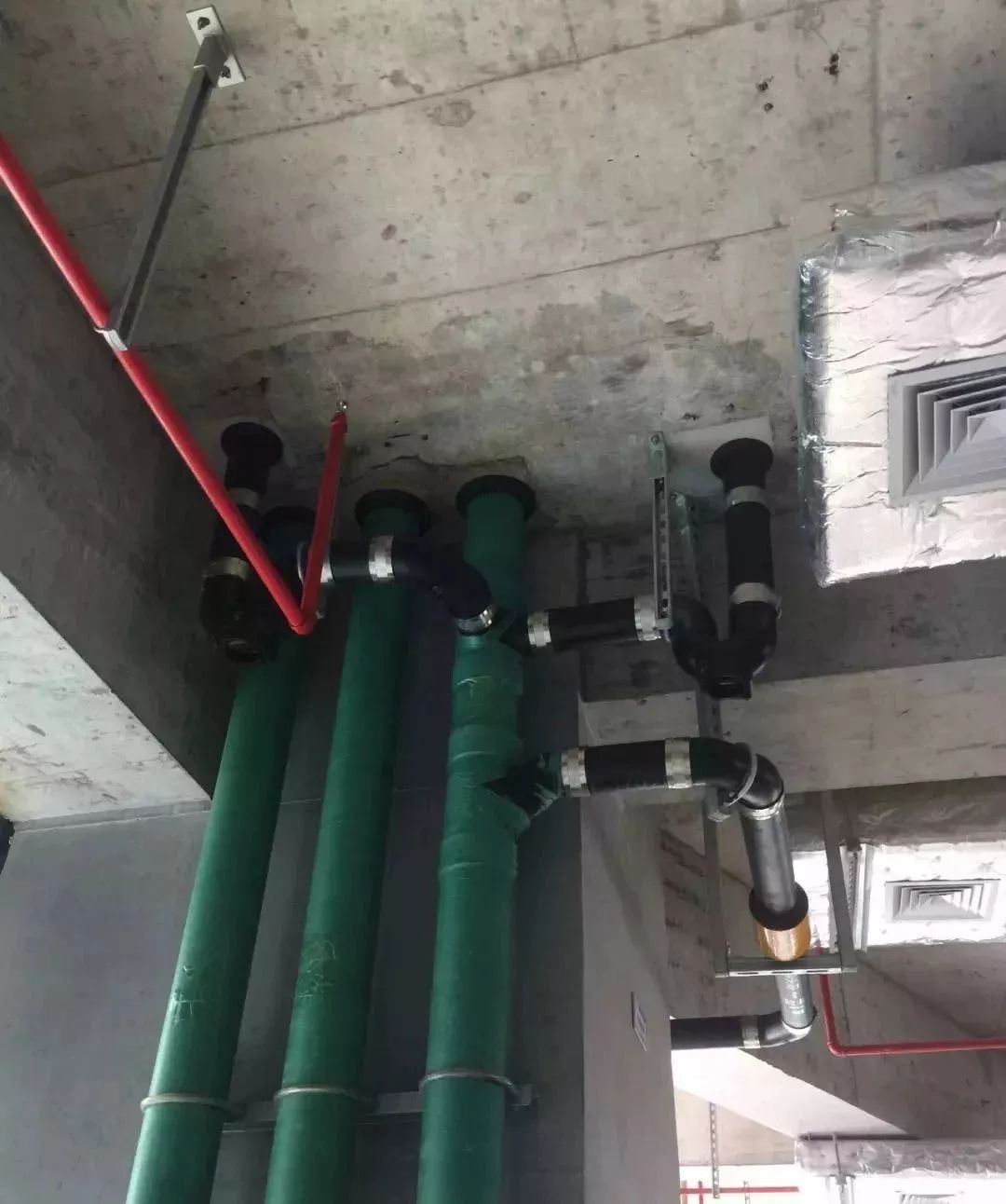 竖向排水管道,外用防护膜保护,支架结实耐用,管根设置橡胶圈,界面分明。
