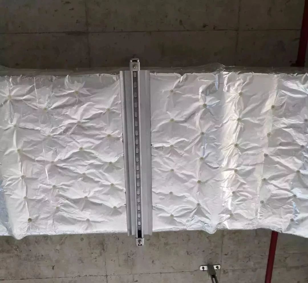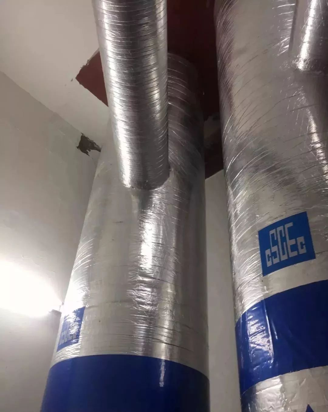 风管保温平整厚实,支吊架处采用钢板平铺过度,保温钉整齐牢固。