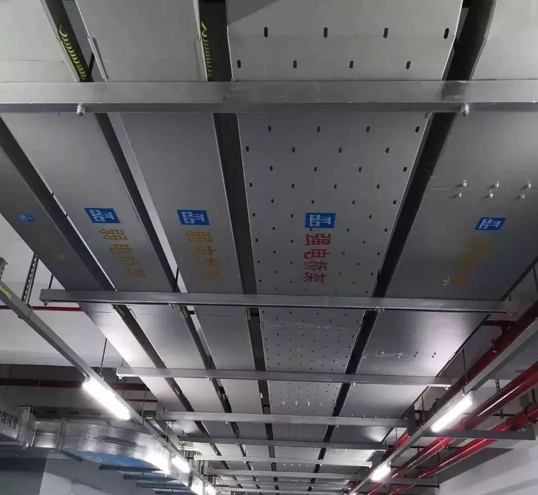 成排桥架,布置合理,共用支吊架采用C型钢+槽钢整体支架体系