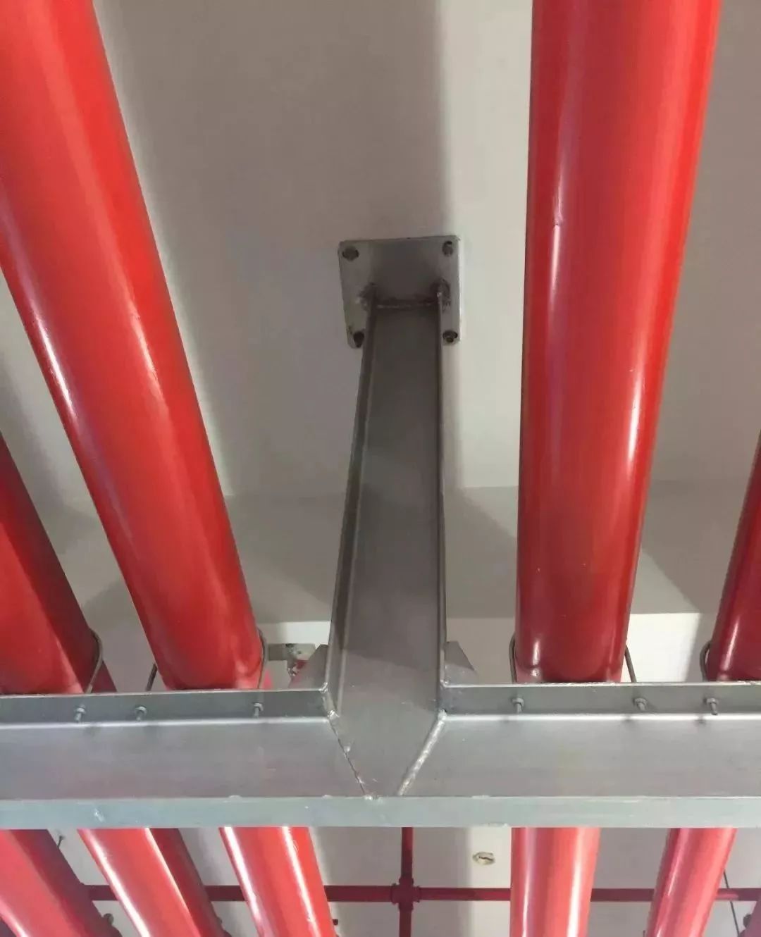 槽钢支架选型正确,加工45度角切割煨弯焊接,吊杆布置合理,端头双螺栓固定,管卡型钢机械开孔。