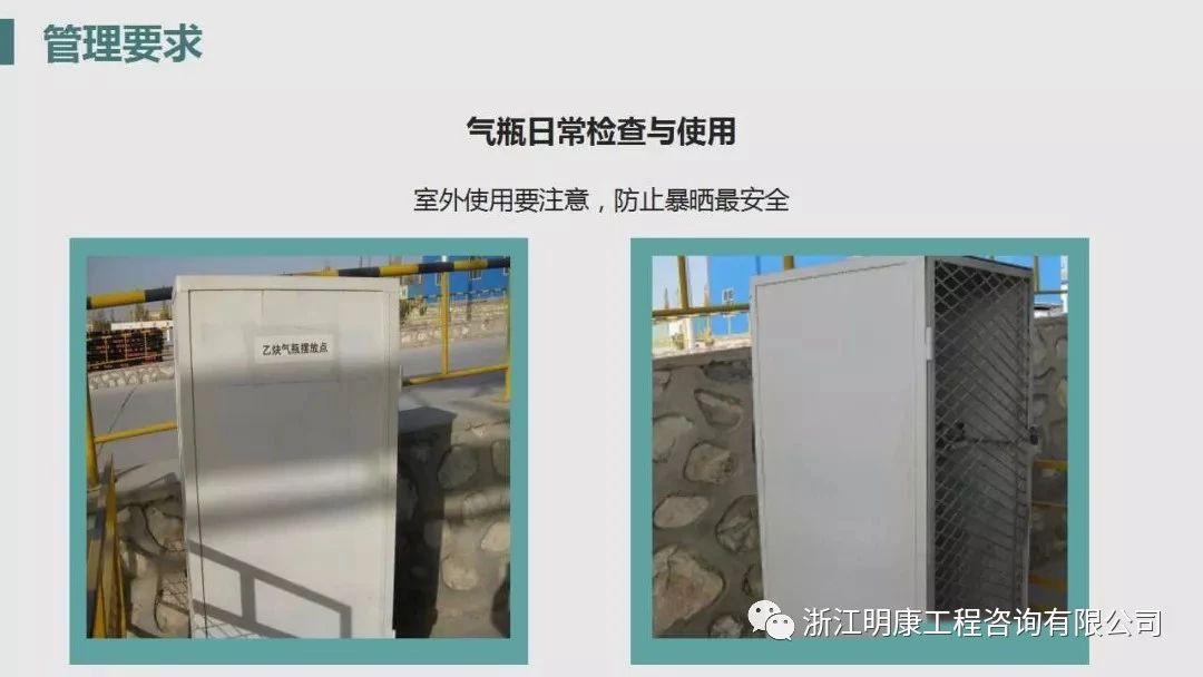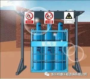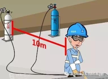 2.气瓶不得靠近热源和电器设备,夏季要有遮阳措施防止暴晒,与明火的距离要大于10米(高空作业时是与垂直地面处的平行距离)。