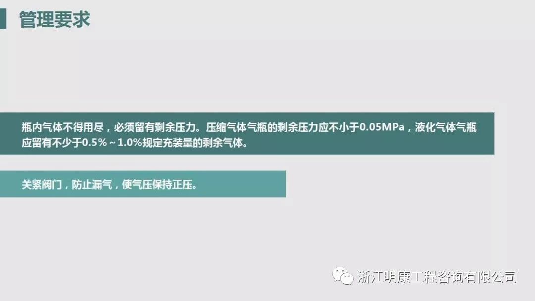 (9)瓶内气体不可用尽,应留有剩余压力。以便充气时检查,还可以防止其他气体倒流入瓶内。