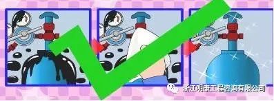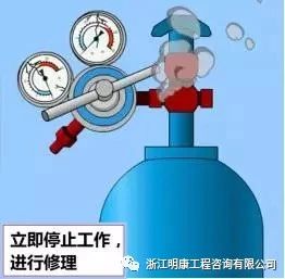 4.在开启瓶阀和减压器时,人要站在侧面;开启的速度要缓慢,防止有机材料零件温度过高或气流过快产生静电火花而造成燃烧。