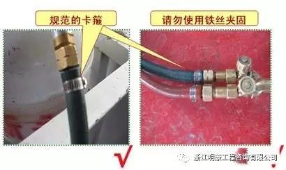 (7)引接气管应无开裂,采用规范的卡箍,严禁使用铁丝夹固。
