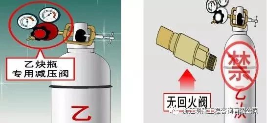 1.乙炔气瓶在使用时必须装设专用减压器、回火防止器,工作前必须检查是否好用,否则禁止使用,开启时,操作者应站在阀门的侧后方,动作要轻缓。