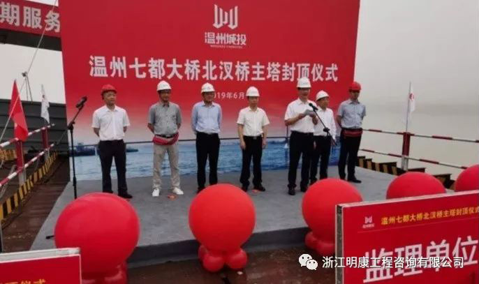 仪式由温州城市建设投资集团有限公司董事长林世楠主持,温州市住房和城乡建设局主任周守权宣布温州市七都大桥北汊桥工程主塔封顶。