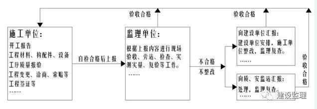 (4)工程质量控制。将《中华人民共和国建筑法》第三十二条、第五十四条,《建设工程质量管理条例》第三十七条,进行现场宣读。并要求施工单位在进行工程项目报验时所使用的现场监理用表,这个表式,虽《建设工程监理规范》中有,但全国各个省份还有地方要求与标准,是对《建设工程监理规范》中的表式进行了微调。当然,监理报表的附件,如工序报验等,一定要符合《建筑工程施工质量验收统一标准》GB50300中的要求。重点强调报验的及时性,做到工程报验资料与工程进度尽量保持同步,即使有所拖延,也要在一周内补齐。一些复试检验合格报告,必须与工程同步,甚至要做在前面,没有复验合格报告,坚决不能进行下一道工序施工。