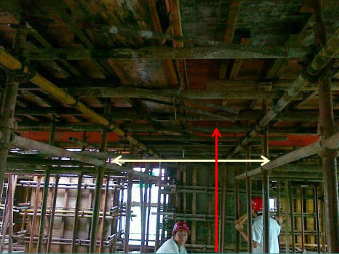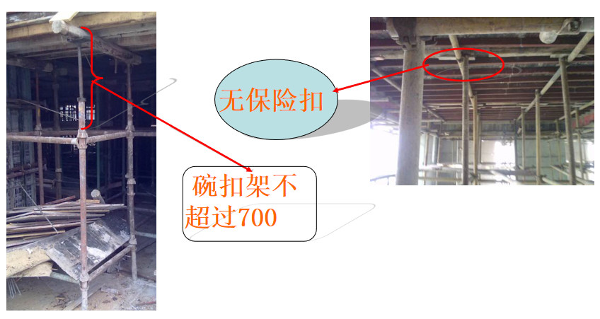 2)支模架不设扫地杆,立、横杆间距过大,防滑保险扣件未扣,上部不设纵横水平杆。
