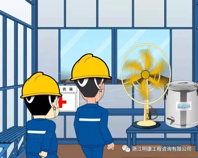 3、保证现场饮水供应充足。现场应供给足够的合乎卫生要求的饮用水等,有效的防暑降温,避免发生中暑事件。