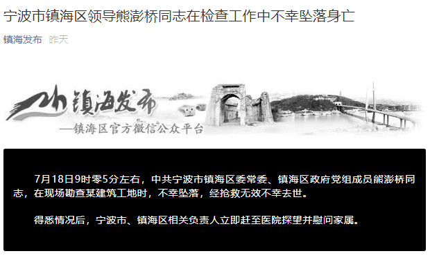 7月18日上午,宁波市镇海区委常委、镇海区政府党组成员熊澎桥,在勘查建筑工地时不幸坠落,经抢救无效身亡。