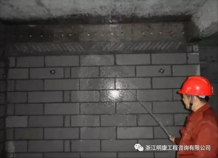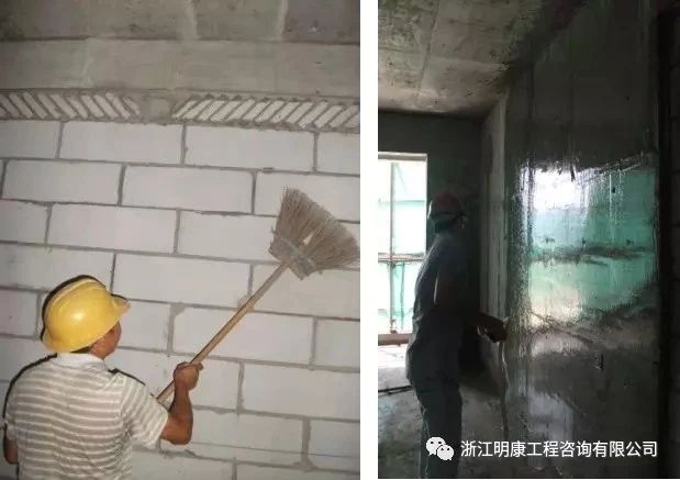 一般在抹灰前一天,用水管或喷壶顺墙自上而下浇水湿润。不同的墙体,不同的环境需要不同的浇水量。浇水要分次进行,最终以墙体既湿润又不泌水为宜。