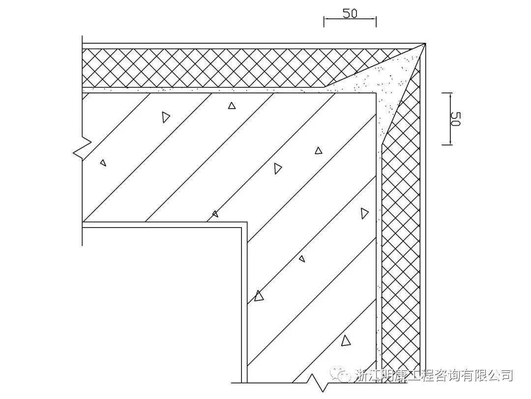 (3)细部处理。外墙抹灰工程施工前应先安装门窗框、护栏等,并应将施工孔洞堵塞密实。室内墙面、柱面和门洞口的阳角做法应符合设计要求。设计无要求时,应采用1:2水泥砂浆做暗护角,其高度不应低于2m,每侧宽度不应小于50mm。