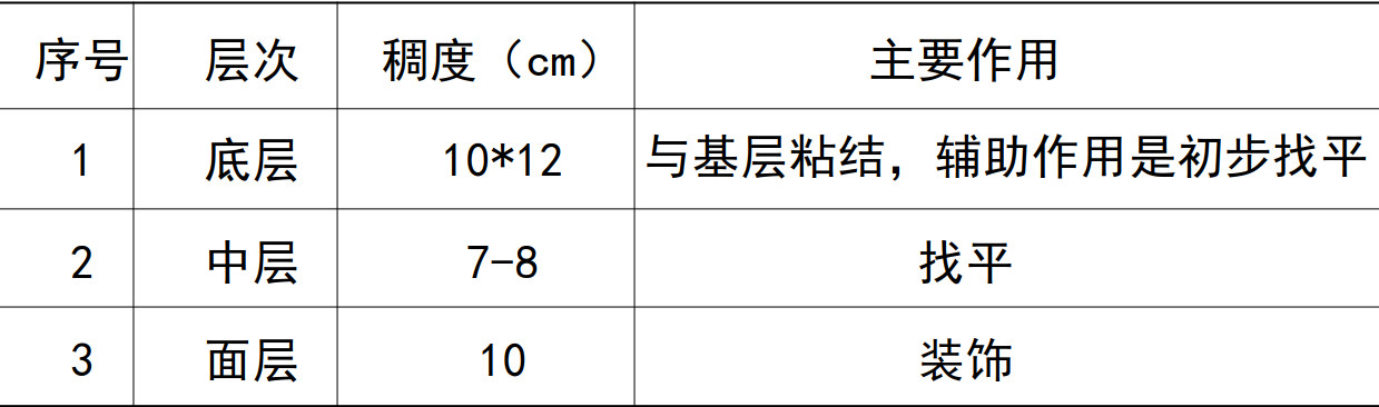 大面积抹灰前应设置标筋。抹灰工程应分层进行,通常抹灰构造分为底层、中层及面层,具体技术要求参照下表。其中,水泥砂浆不得抹在石灰砂浆层上;罩面石膏灰不得抹在水泥砂浆层上。