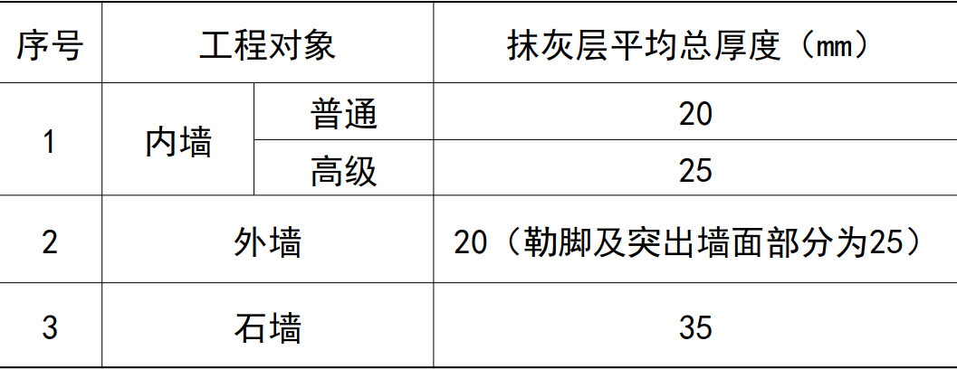 抹灰层的平均总厚度应符合设计要求。通常抹灰构造各层厚度宜为5~7mm,抹石灰砂浆和水泥混合砂浆时宜为7~9mm。当设计无要求时,抹灰层的平均总厚度不应大于下表的要求。