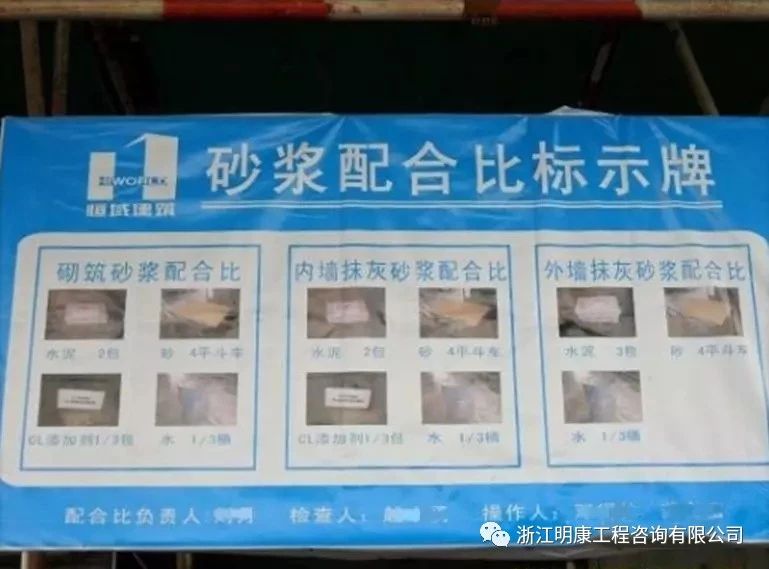 拌制现场悬挂傻瓜式配合比牌:将重量换算成容器计量桶(车),便于操作。