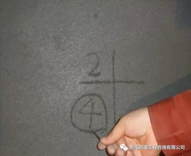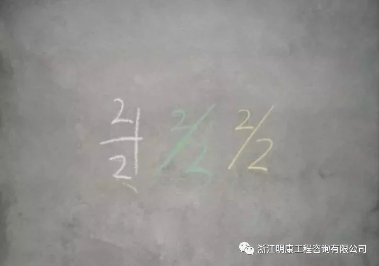 抹灰完成后,总包、监理、甲方实测结果分别用白、蓝、红色粉笔标注在墙面上。