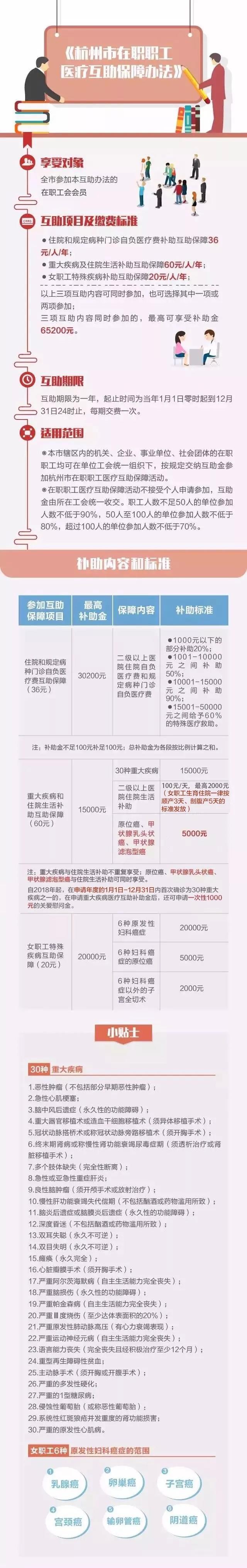 杭州市总工会推出的以互助互济为主要特征的《杭州市在职职工医疗互助保障办法》,包含了住院和规定病种门诊自负医疗费补助互助保障、重大疾病和住院生活补助互助保障、女职工特殊疾病补助互助保障三项内容。换句话说,就是医保不承担的部分,医疗互助相当于起了“二次报销”的作用。在一个互助周期内,最高补助金可达65200元。