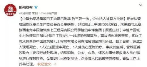 8月28日上午9时30分左右,在郑州市管城回族区未来路与凤凰路西南角,中博集团(原杨庄村)中博片区城中村改造项目B地块项目工程发生一起塔吊倒塌事故。截至目前,事故造成2人现场死亡,1人在送医途中死亡,1人受伤在医院治疗。