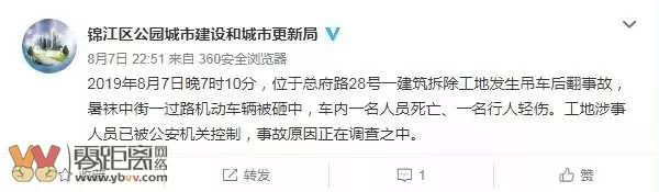 8月7日,四川成都一在建工地塔吊在无人作业的情况下突然倒塌。塔吊上本依附于在建楼房的安全锁扣,因为承受不住压力断裂脱离。塔吊缓缓地砸向了地面,因为塔吊的高度超出了工地楼房倒围墙的距离,塔吊半个身子砸向了隔壁小区。