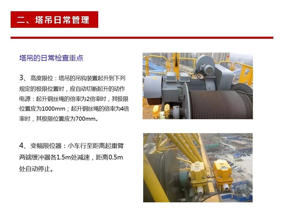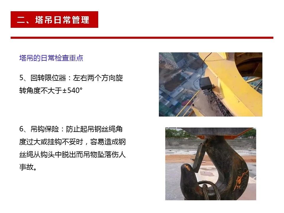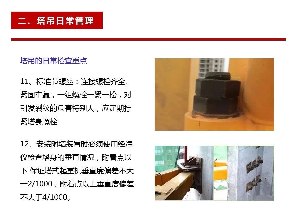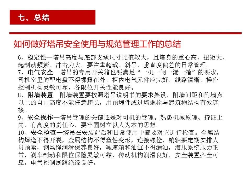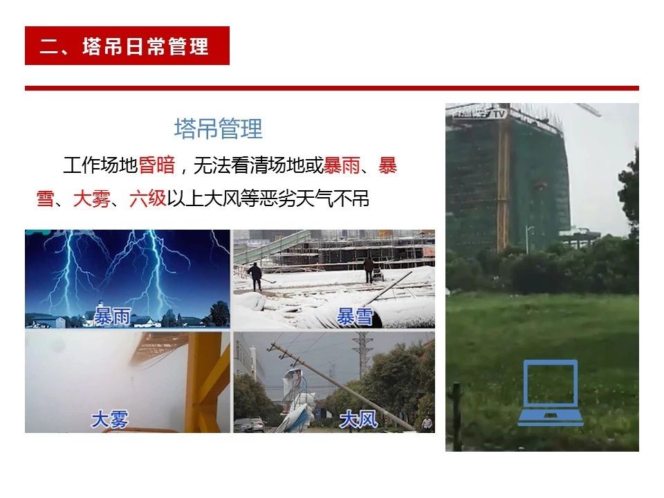 1. 台风来临前,检查塔身、附着装置、机构、广告牌、电气箱、灯具等,是否连接牢固,吊钩升到最高处,吊臂应能随风转动,回转范围内不能有障碍。