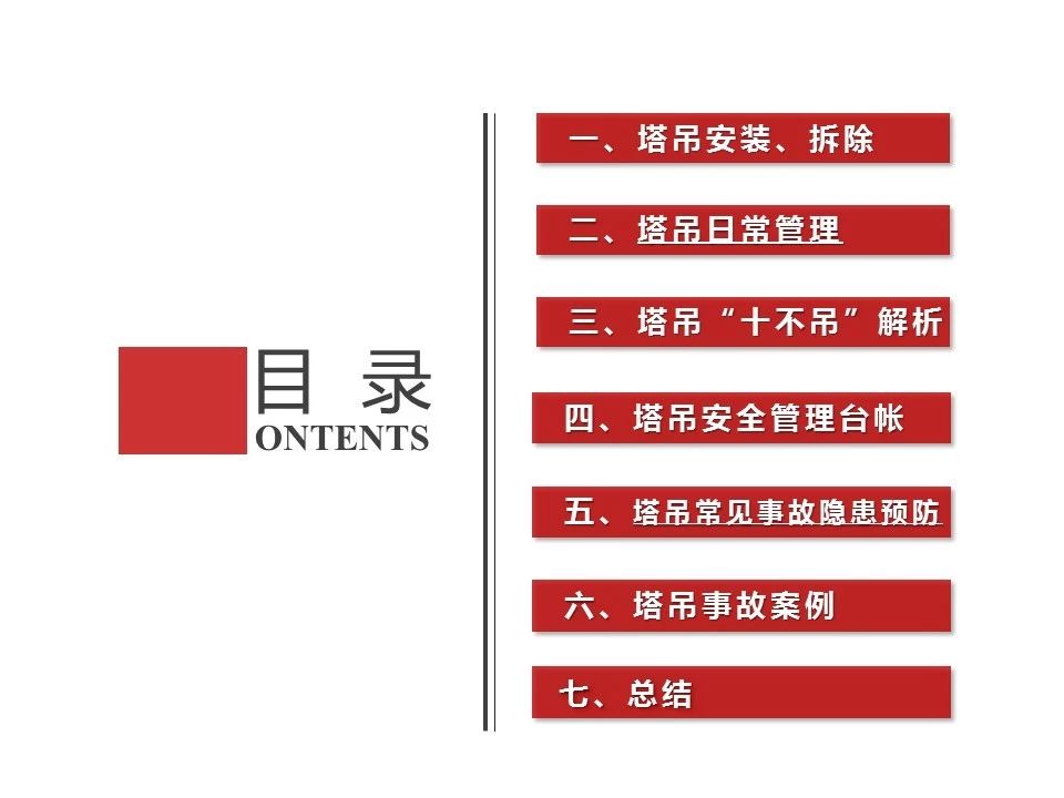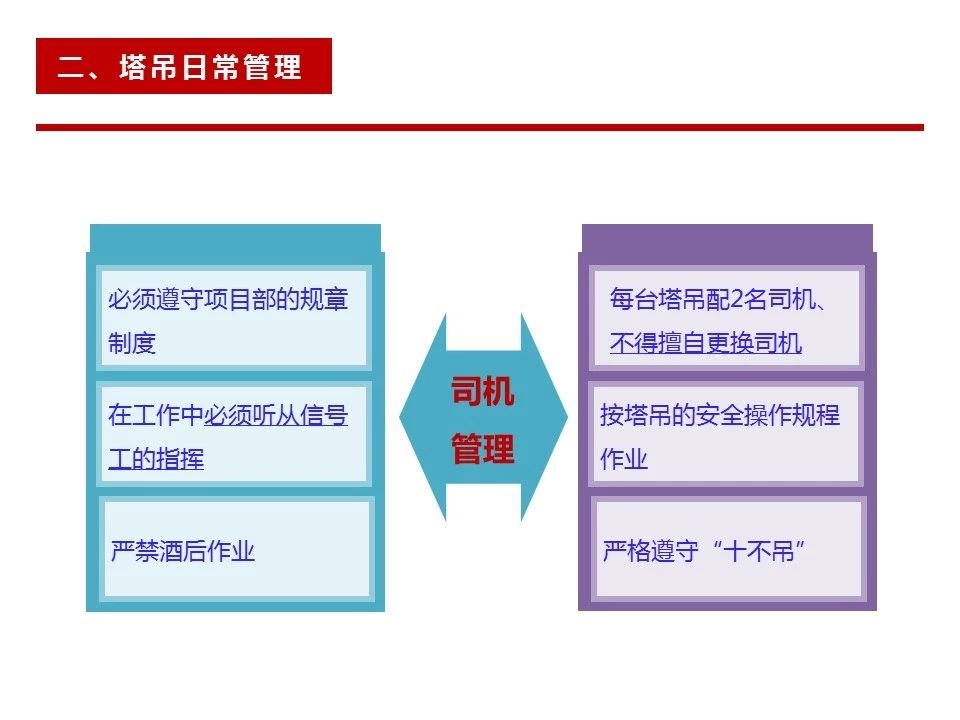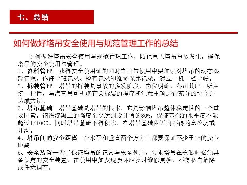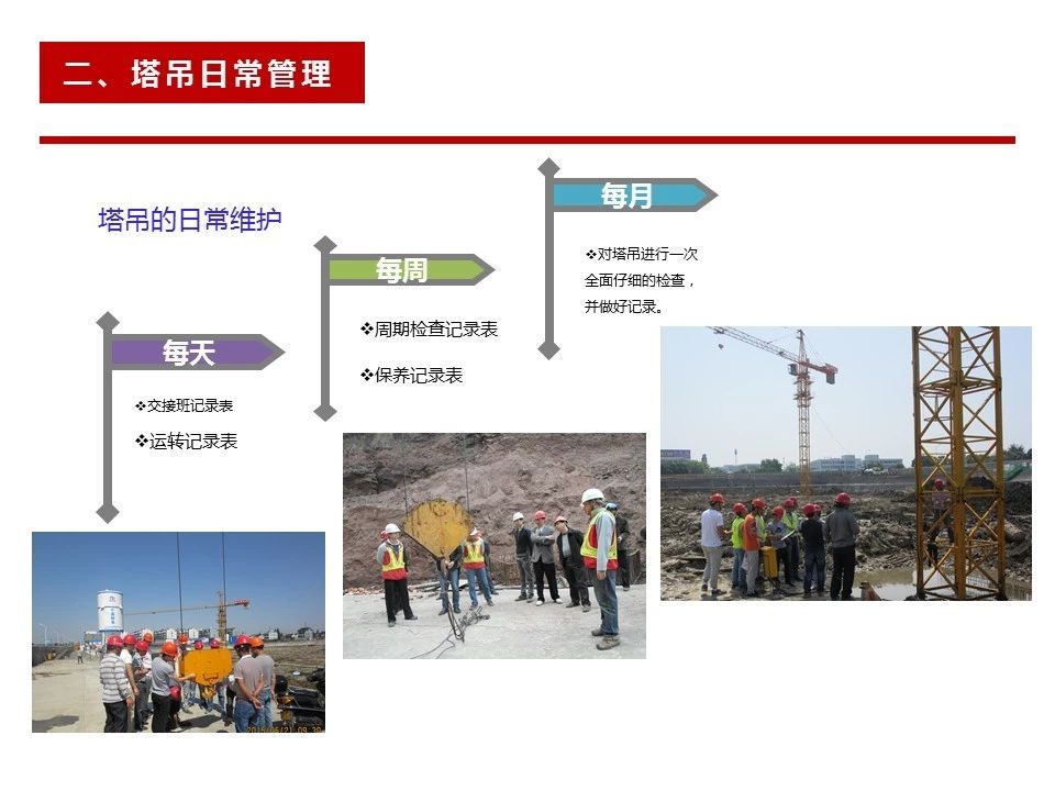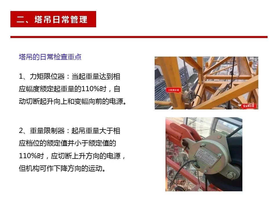 1. 台风来临前,检查塔身、附着装置、机构、广告牌、电气箱、灯具等,是否连接牢固,吊钩升到最高处,吊臂应能随风转动,回转范围内不能有障碍。