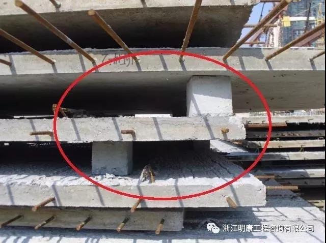 预制构件现场随意堆放,出现上下排木方垫块不在一条直线,极容易产生裂缝