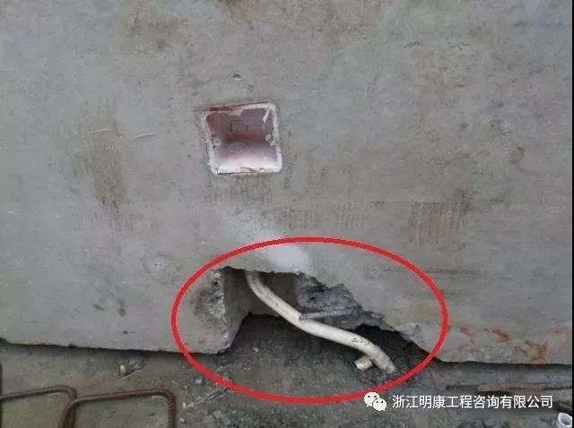 现场发现部分预制构件预埋管缺少、偏位等现象,造成现场安装时需在预制构件凿槽等问题,容易破坏预制构件
