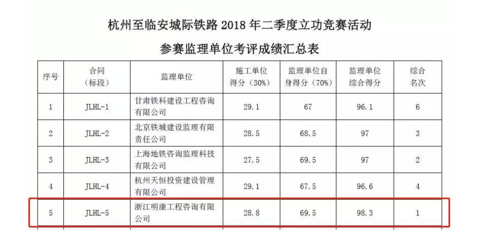 在杭州至临安城际铁路监理单位竞赛考评中,我司监理的(JLHL-5 标)以98.3分的优异成绩摘得桂冠。