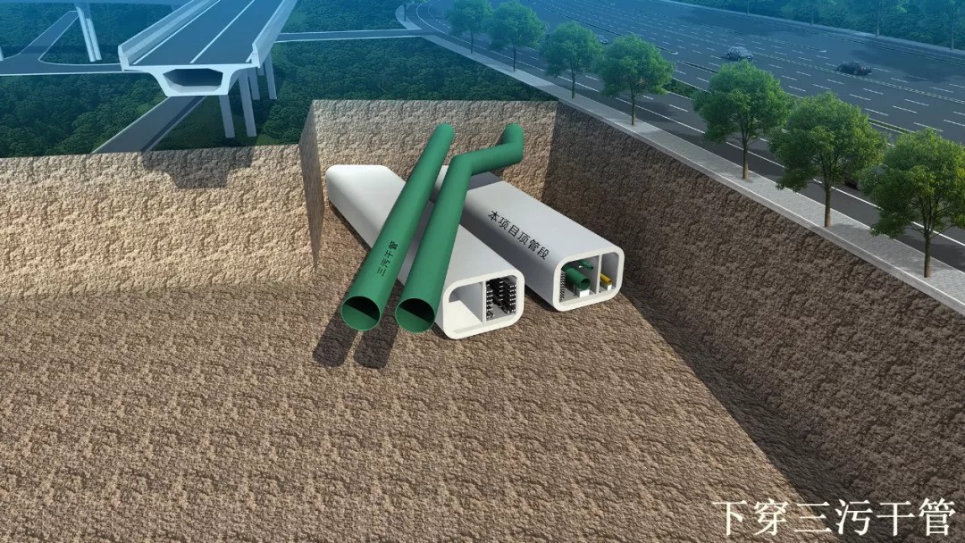 于11月7日晚20点08分贯通的下穿三污干管矩形顶管段是本次工程中施工难度最大的一段,全长106.5米,以30°斜交下穿DN2200三污干管。