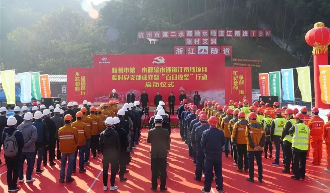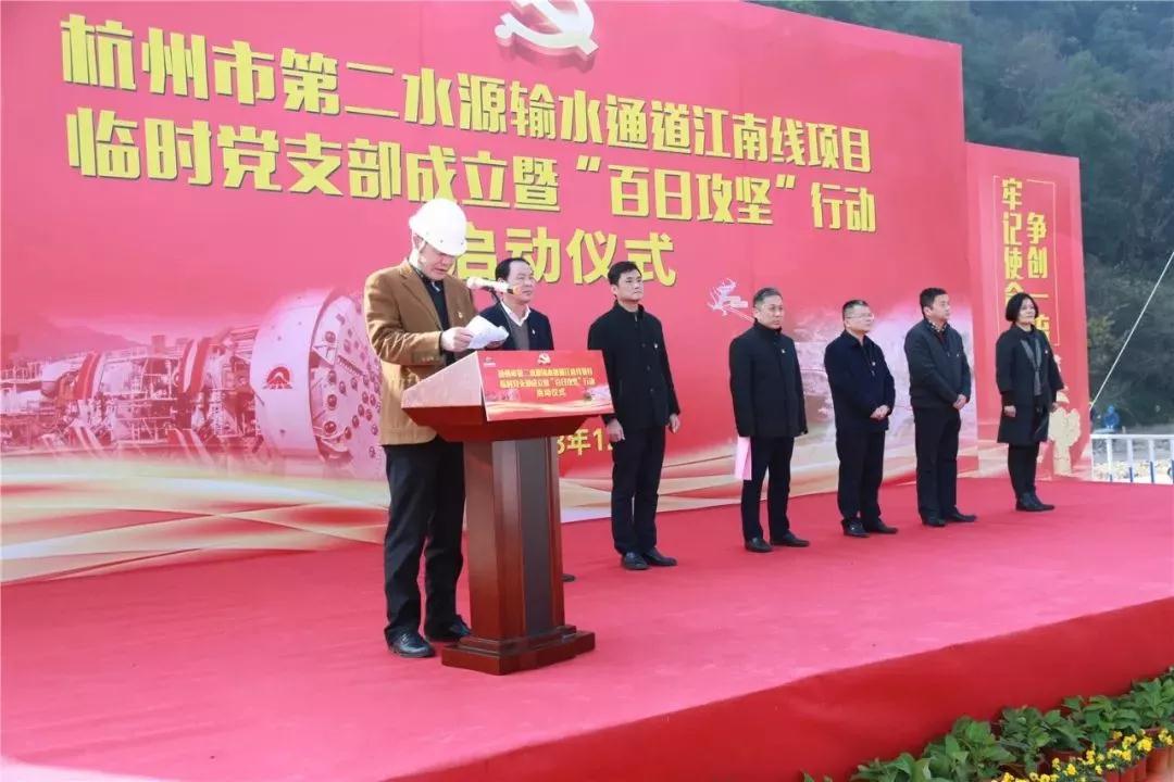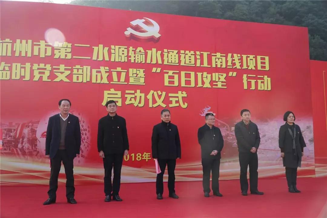 为积极发挥项目临时党支部的战斗堡垒作用和党员先锋模范作用,确保杭州市第二水源输水通道江南线工程安全、优质、高效、快速地推进,12月17日上午,杭州市第二水源输水通道江南线项目临时党支部成立暨“百日攻坚”行动启动仪式在江南线山岭段滕村支洞前广场隆重举行。