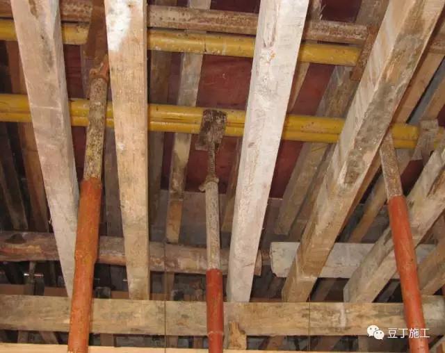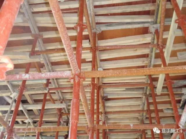 当板底下的次龙骨(木楞)及主龙骨(双钢管)按标高控制线(标高可通过可调顶托调整)安装完毕之后,就可以安装顶板的竹胶合板。在安装顶板模板时,用钉子将其与板底木楞固定,并确保模板安装牢固、平整、拼缝严密。