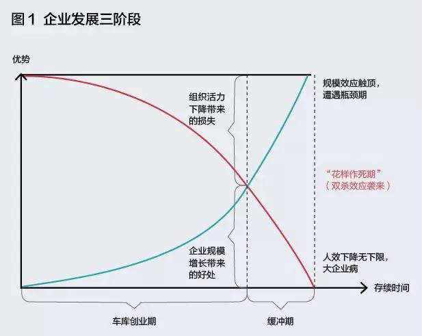 “车库创业期”最多持续几年,随着员工人数增加导致分工不均、组织内人际关系开始复杂、个人职业倦怠产生等情况逐渐出现,组织活力会迅速下降,这个过程几乎不可逆转。有意思的是,不少互联网企业就喜欢将这种短期的“故事”当做一种“模式”,强调“创业精神”,强调“去管理化”,这直接导致管理的粗放,并带来不可估量的后果。